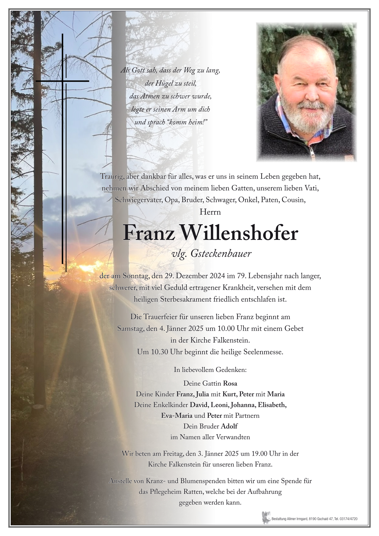 Lieber Franz,du wirst mir fehlen, doch sei dir die ewige Ruhe von Herzen gegönnt.Mein aufrichtiges Beileid der Familie Willenshofer 🌠