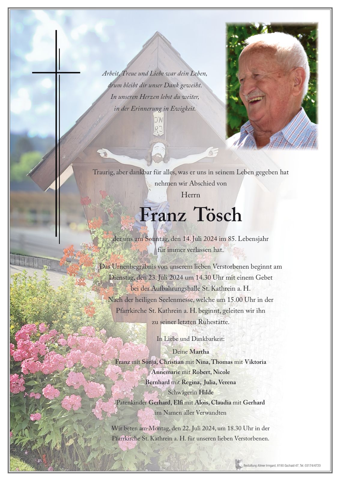 Lieber Franz Ruhe gut,unser aufrichtiges Beileid deiner Familie Fam.Schiester Johann