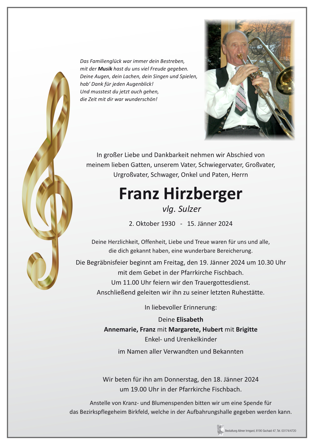 Liebe Monika dir und deiner lieben familie Aufrichtiges Beileidzum Tod eures lieben Opa. Er war so einl lieber und guter musiker er wird im himmel mit den Engerl musiziern. Maximum