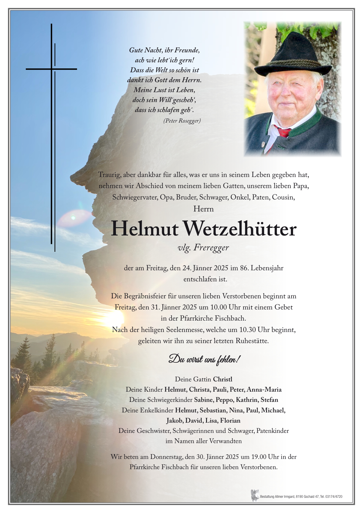 Ruhe sanft in Gottes Hand lieber Heli. Unser aufrichtiges Beileid der ganzen Trauerfamilie. Manfred und Herta Schwaighofer