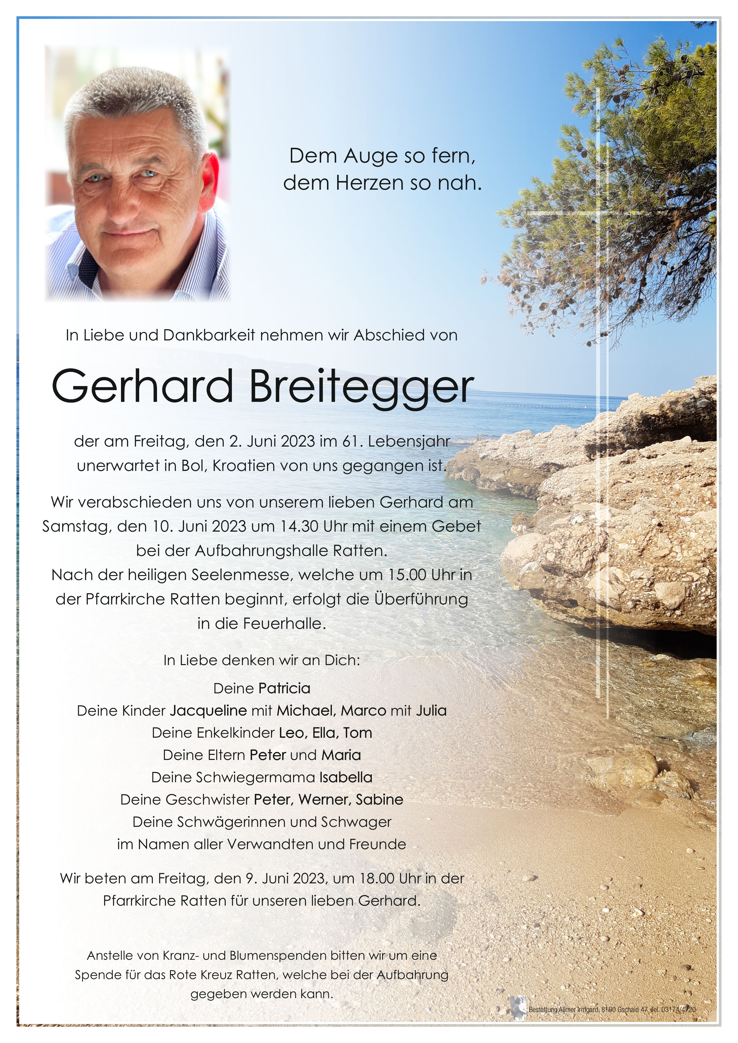 An die liebe Familie Breitegger mein aufrichtiges Beileid und Mitgefühl! Ich wünsche euch viel Kraft, Liebe und Zusammenhalt! Mach's gut, Gerhard! Sabrina