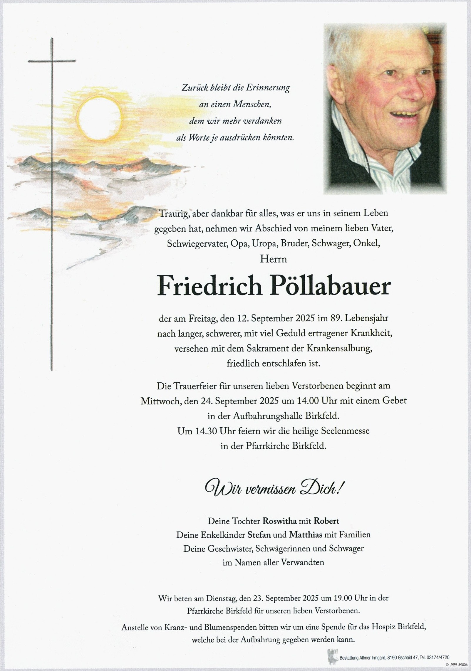 Unser herzliches Beileid! lieber Fritz ruhe in Frieden. Hans und Andrea Pfummerl