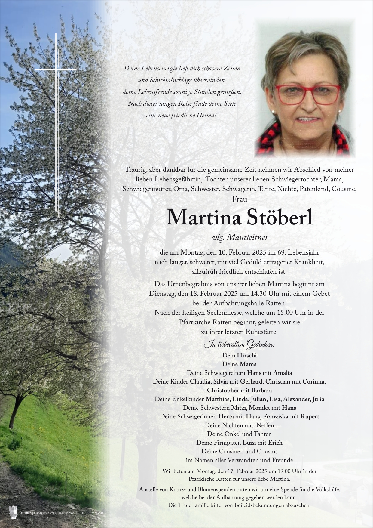 Unser aufrichtiges Beileid der Trauerfamilie Monika und Sepp Albert. Wenn du bei Nacht den Himmel anschaust,wird es dir sein,als lachten alle Sterne,weil ich auf einem von ihnen wohne.weil ich auf einen von ihnen lache. Ruhe in Frieden liebe Martina.