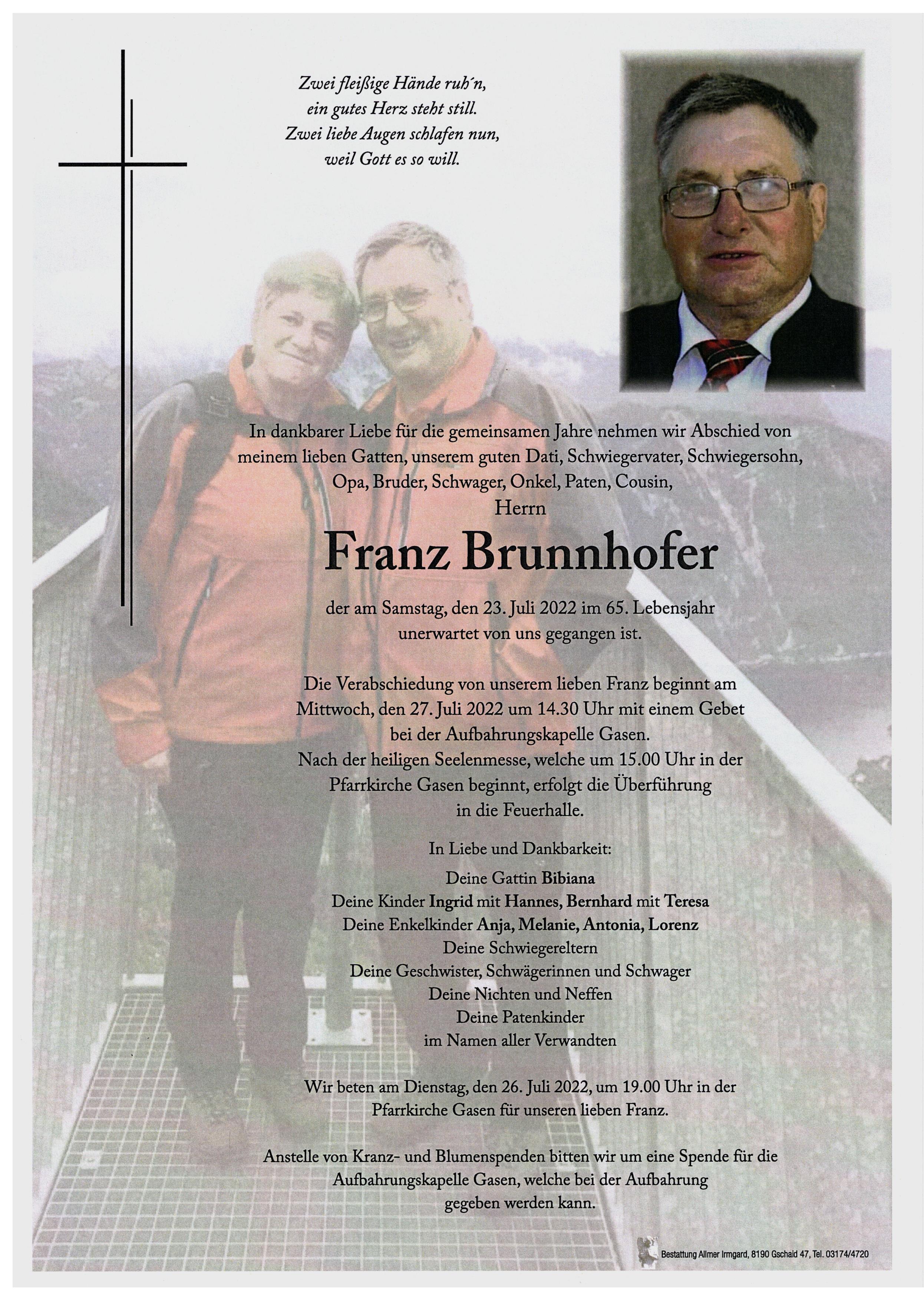 Leider konnten wir dir nicht mehr helfen! Mach’s gut, Franz! Herzliche Anteilnahme Karl u. Maria E. mit Familie