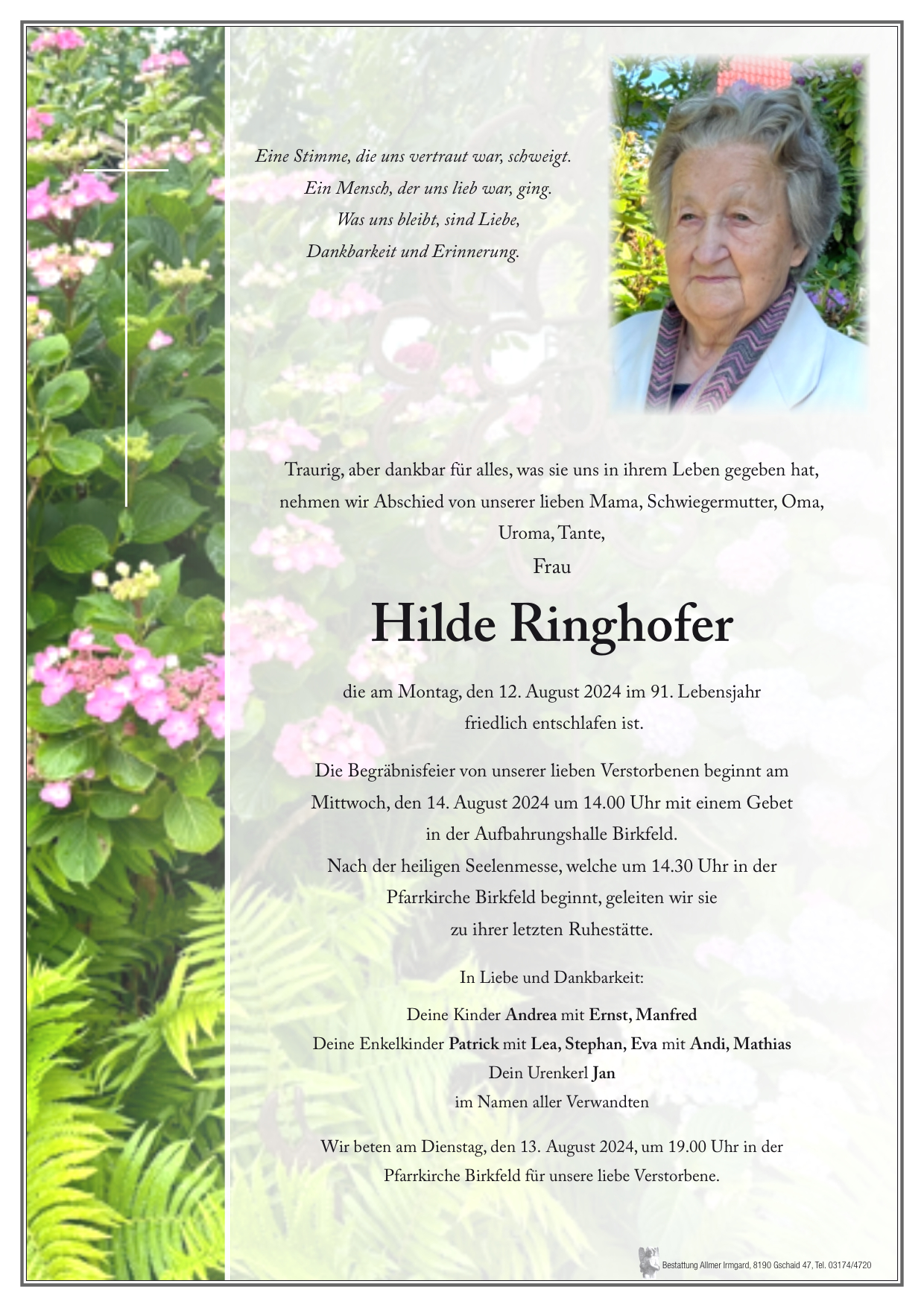 Mein herzliches Beileid !! Mögen Engel dich begleiten liebe Hilde ! Ingrid Schellnegger aus Weiz ...vormals Baumegger