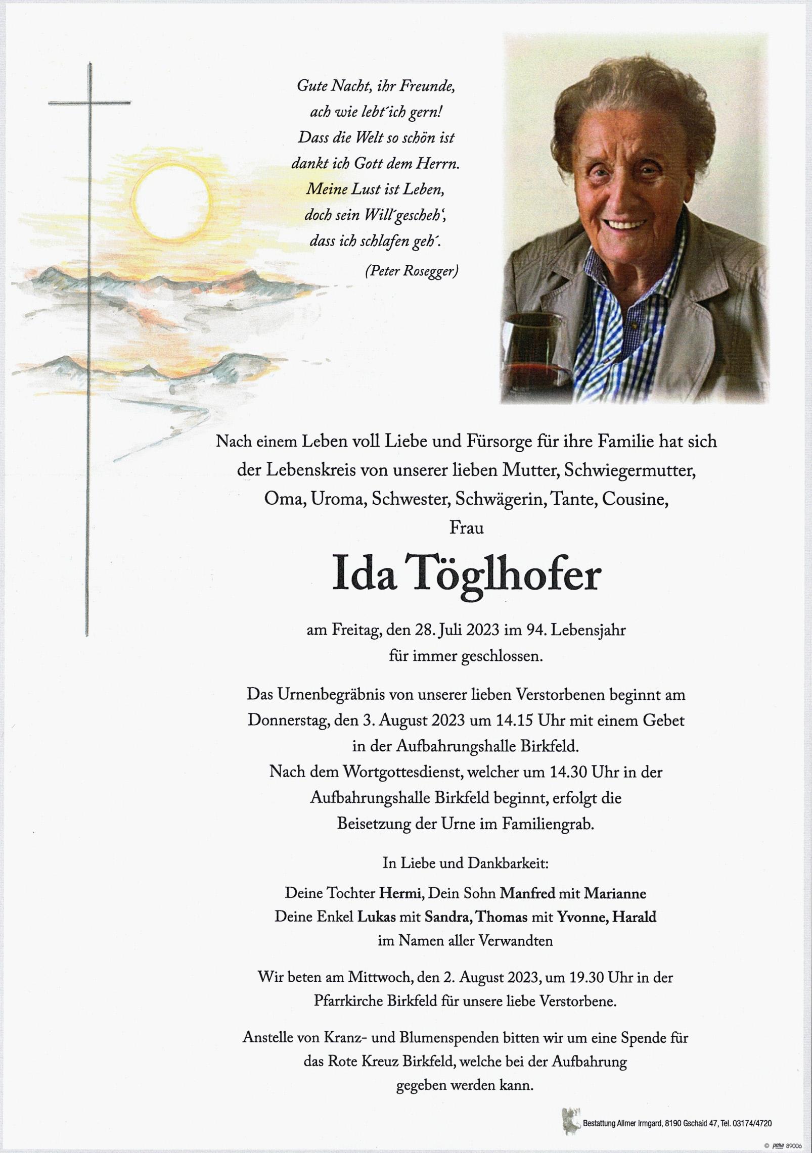 Ruhe in Frieden liebe Ida ! Letzte Grüße Ingrid Schellnegger ( vormals Baumegger )