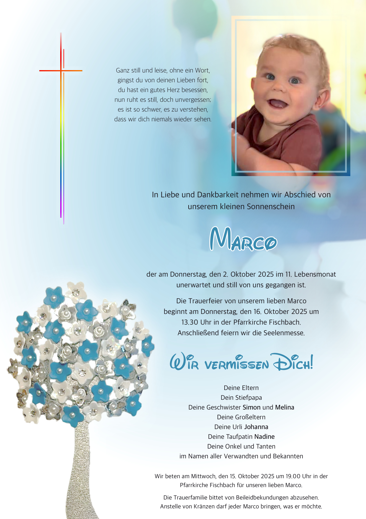 Meine kleine Seele ich lass dich gehen, den ich weiß wir werden uns wieder sehen. Wir lieben dich von ganzem Herzen du wirst immer in unserem Herzen sein. An meinen Engel Marco deine Mama & Manfred + Melina + Simon du bleibst unvergessen mein Schatz