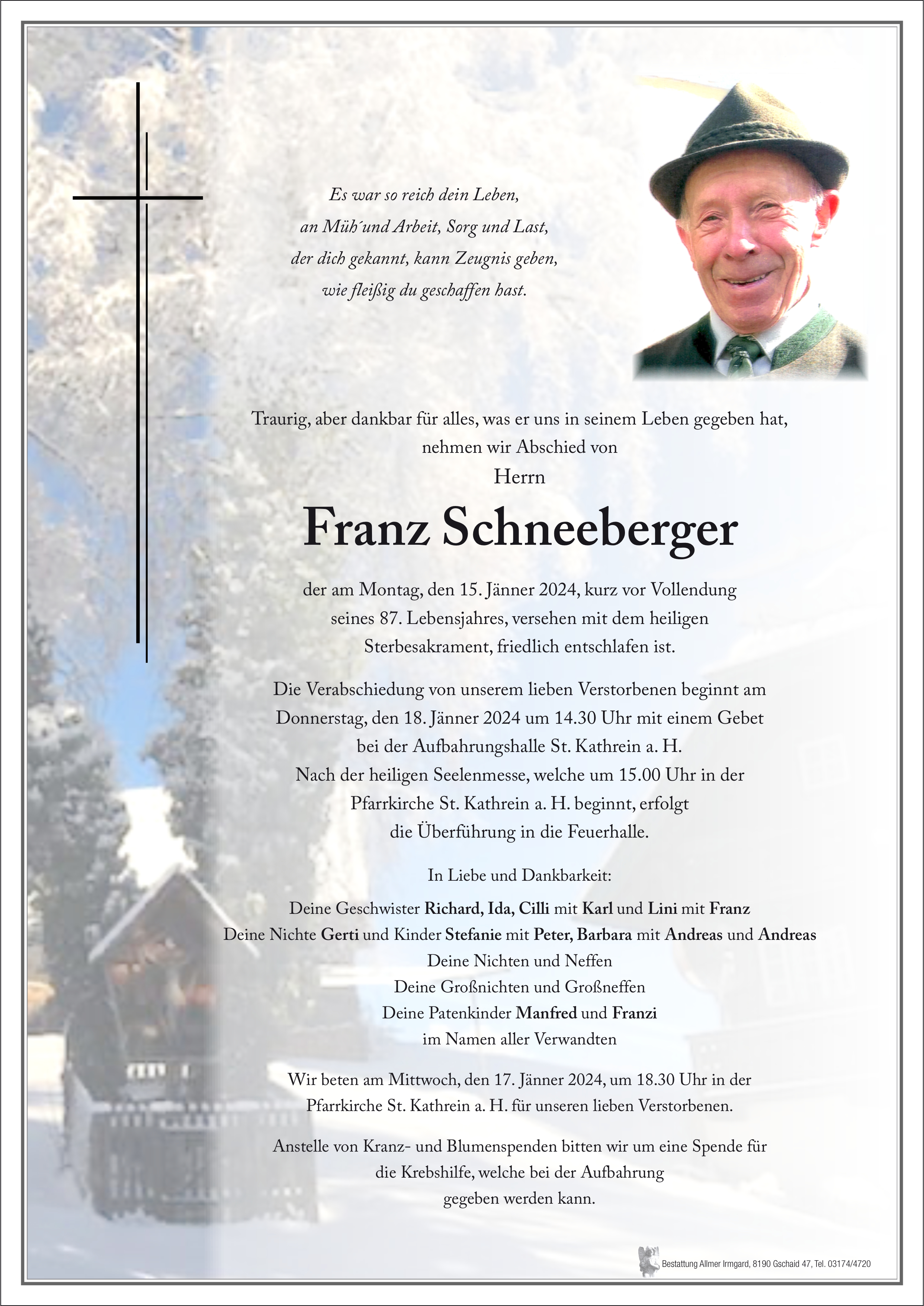 Unsere aufrichtige Anteilnahme am Tod eures lieben Franz! Familie Alexandra, Erwin, Anja und Claus Goger