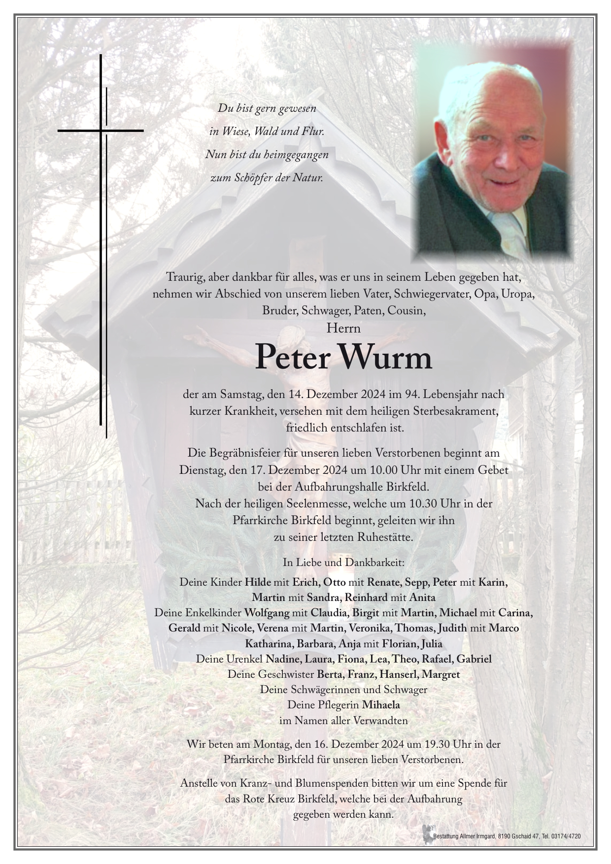 Pfiat di lieber Peter. Amoi seg,n ma uns wieder. Inniges Beileid der Familie. Maria Fuchs.