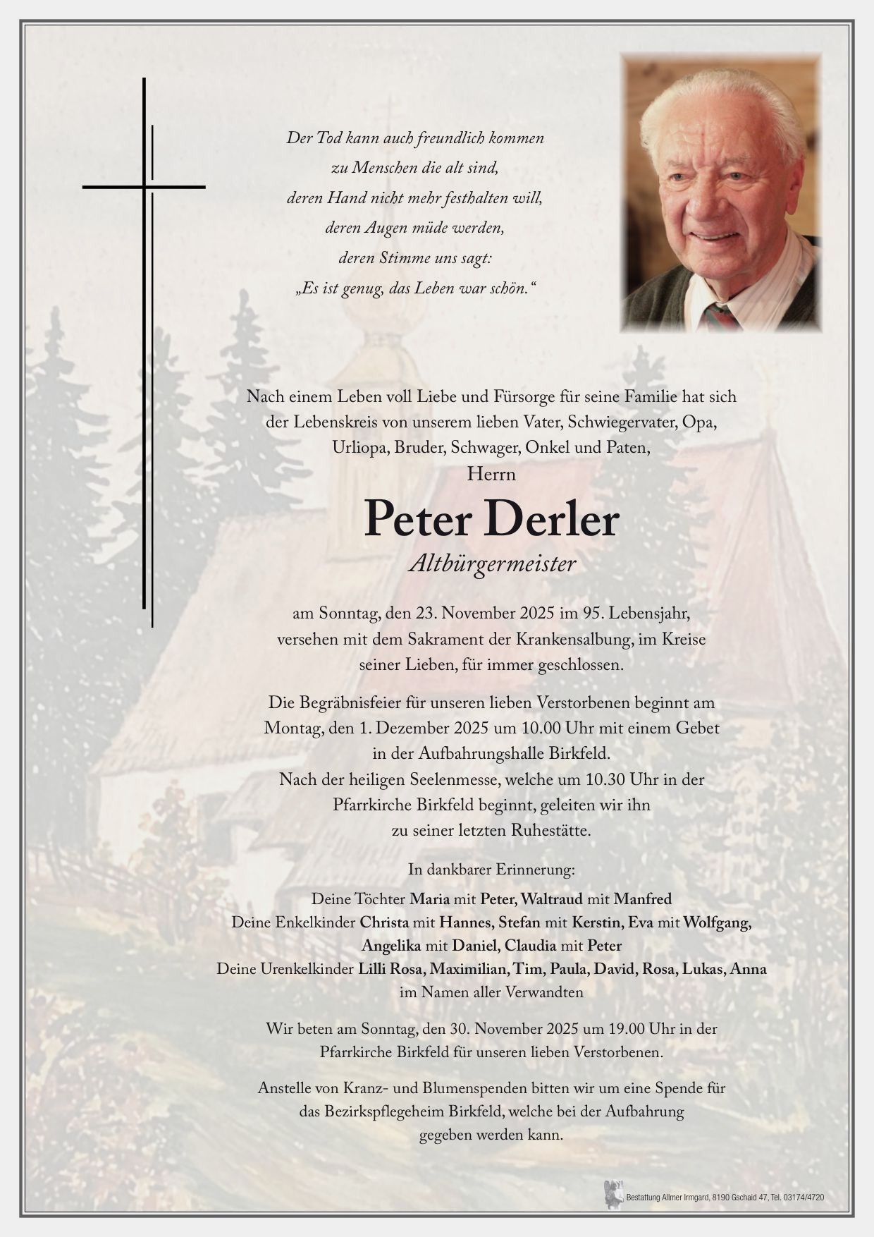 Habe Herrn Bgm. Derler jahrelang überaus geschätzt. Die ewige Ruhe nach dem reichen Leben gönn ich ihm. Anteilnahme