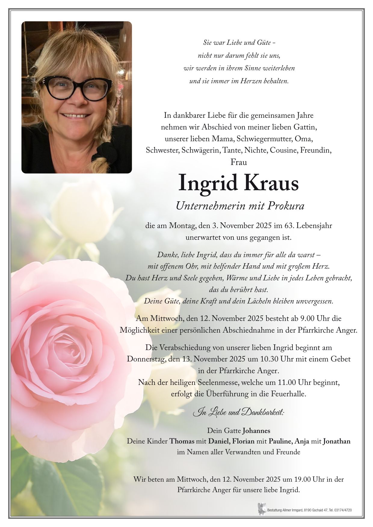 Ingrid hat mit ihrer positiven Art viele Herzen berührt. Ihr Lächeln, ihre Wärme und ihre Lebensfreude werden uns fehlen. Unser tiefes Mitgefühl gilt ihrer Familie. Steffi & Andi